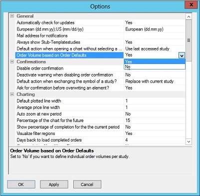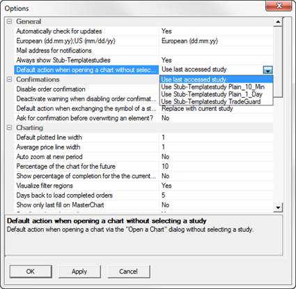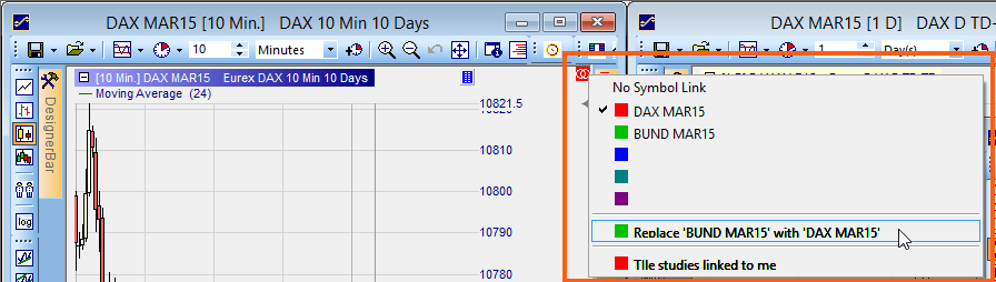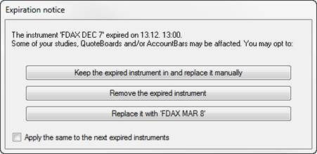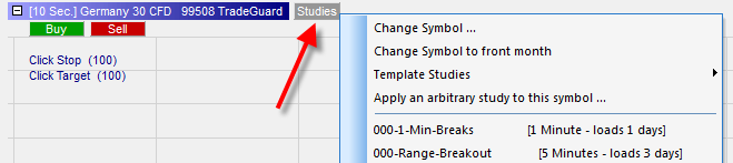 - NanoTrader zeigt Studien jetzt auch dann an, wenn der zugrundeliegende Kontrakt abgelaufen ist. Das "Öffnen"-Icon des Chart-Fensters hat einen neuen Eintrag "Diese Studie auf den aktuellen Kontrakt anwenden", so dass leicht auf den aktuellen Kontrakt umgestellt werden kann.