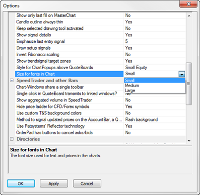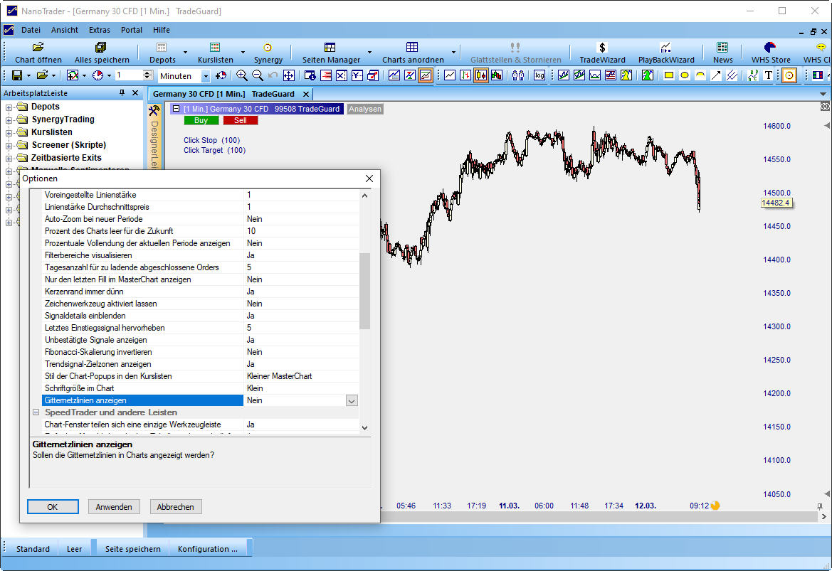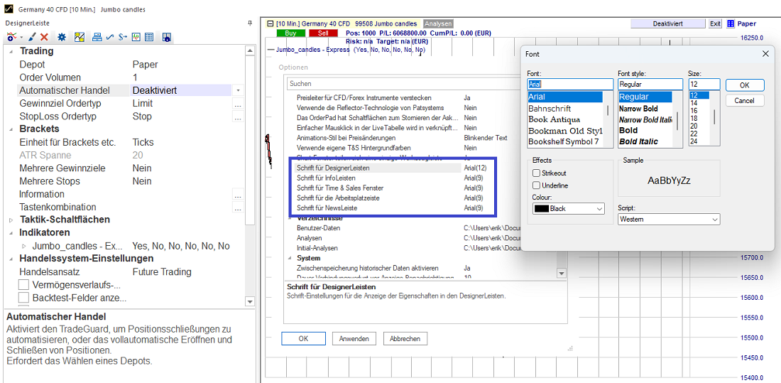 - NanoTrader erlaubt die Konfiguration der Schrifteinstellungen für DesignerLeiste, InfoLeiste, NewsLeiste, Time & Sales Leiste and Arbeitsplatzleiste.
