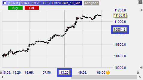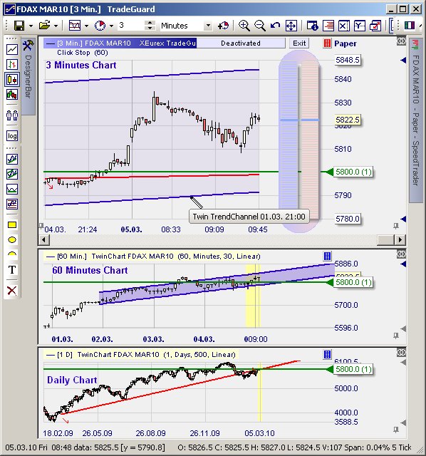 - Zwillings-Charts erlauben die Darstellung der Preisdaten in einer vom MasterChart unabhängigen Aggregation. Beispielsweise kann der MasterChart 3-Minuten-Kerzen anzeigen, ein Zwillings-Chart 60-Minuten-Kerzen und ein weiterer Zwillings-Chart Tagesdaten. Auf diese Weise können kurzfristige Preisbewegungen sehr einfach in Relation zu längerfristigen Bewegungen eingeschätzt werden. Außerdem sind Zwillings-Charts sehr hilfreich beim Bestimmen langfristiger Trends sowie von Widerstand/Unterstützungslinien, die auch beim kurzfristigen Handel berücksichtigt werden sollen.