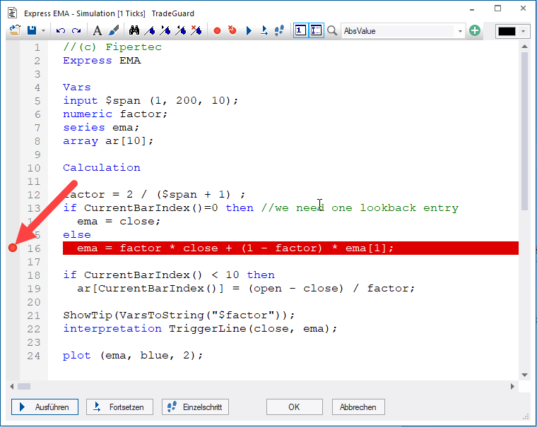Um den Express-Code zu anzusehen oder zu ändern, doppelklicken Sie auf den BETrailStop-Eintrag in der DesignerLeiste, nachdem der Stop übder den "Indikator hinzufügen"-Dialog eingefügt wurde.