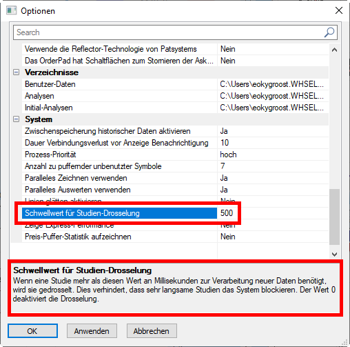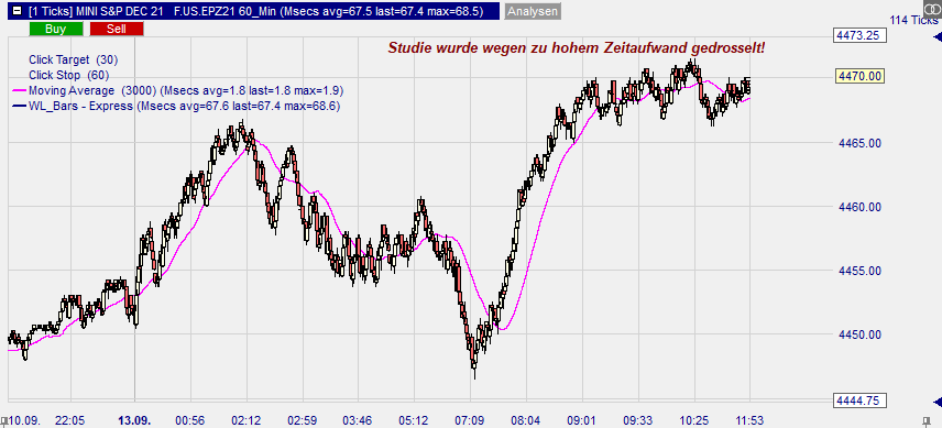 - Studien, deren Berechnung zu viel Prozessorleistung erfordert, können gedrosselt werden. Dies kann zum Beispiel durch ein schlecht programmiertes Express-Skript oder zu viele geladene historische Daten verursacht werden. Wenn die durchschnittliche Rechenzeit für eine Studie den konfigurierten Schwellwert überschreitet, wird die Studie gedrosselt. Gedrosselt bedeutet, dass die Studie nur noch einmal alle fünf Sekunden aktualisiert wird. Eine gedrosselte Studie ist an der entsprechenden Einblendung im MasterChart zu erkennen: