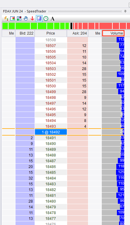 Das Volumen wird in einer separaten Spalte als Zahl und als Histogramm-Balken angezeigt. Das Histogramm wird bezogen auf das maximale gehandelte Volumen aller Ausführungspreise normalisiert (nicht nur bezogen auf die momentan angezeigten Preise).